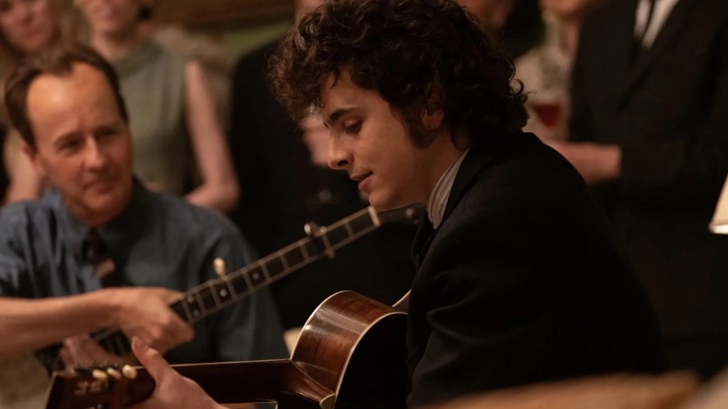 A Complete Unknown (2024) is directed by James Mangold and stars Timothee Chalamet, Elle Fanning, Monica Barbaro, Edward Norton, Joe Tippett, Eriko Hatsume, Scoot McNairy, Dan Fogler, David Alan Basche, Norbert Leo Butz, Boyd Holbrook, P.J. Byrne, and Charlie Tahan. The film begins in 1961 with a 19-year-old Bob Dylan as he travels from a small town in northern Minnesota all the way to the bustling streets of New York City in order to meet his musical hero, folk legend Woody Guthrie (McNairy). This puts Bob in contact with Pete Seeger (Norton), another famous folk musician who takes Bob under his wing. Bouncing around from stage to stage, Bob soon begins a romantic relationship with a local painter, Sylvie Russo (Fanning). After Bob’s popularity rises to heights he never expected, he falls head-over-heels for Joan Baez, another famous folk musician who inspires him to record original songs. When the world begins to see him as some kind of modern folk hero after the release of his second studio album, Bob struggles to adjust to his newfound fame. After Bob finds himself sick of folk music on the verge of his 4th album, he controversially decides to record with electric instruments. This decision eventually culminates in the 1965 Newport Folk Festival where Bob faces intense scrutiny from a folk community that once considered him their golden goose.