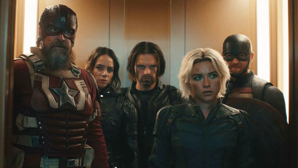 Thunderbolts* (2025) is directed by Jake Schreier and written by Eric Pearson & Joanna Calo. It stars Florence Pugh, Lewis Pullman, Sebastian Stan, David Harbour, Wyatt Russell, Hannah John-Kamen, Julia Louis-Dreyfus, Geraldine Viswanathan, Olga Kurylenko, Wendell Pierce, Violet McGraw, and Alexa Swinton. The film follows Yelena Belova (Pugh) after she accepts one final mission from Valentina Allegra de Fontaine (Louis-Dreyfus). When the mission goes sideways, Yelena is forced to team up with a ragtag group of mercenaries that includes John Walker aka U.S. Agent (Russell), Ava Starr aka Ghost (John-Kamen), and Antonia Dreykov aka Taskmaster. Framed for crimes they did not commit, the group enlists the help of Yelena’s father, Red Guardian (Harbour), and more importantly, Bucky Barnes (Stan). On a quest to clear their names, the ragtag team faces off against Sentry (Pullman), a mostly benevolent superhero who harbors an unstable dark side.